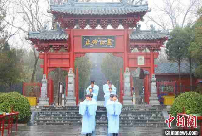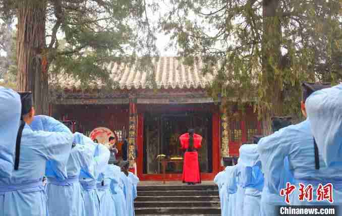 “大学之道,在明明德,在亲民,在止于至善。”当日的先圣殿前,十余位青年人身穿汉服,齐声敬诵儒家经典《大学》,这是嵩阳书院拜孔仪式中的经典诵读环节。先圣殿是祭奠孔子的场所,又叫先师祠。面阔三间,建于一米多的基台之上。殿中按照画圣吴道子所绘制的孔子画像塑造了高2.21米孔子行教立像。