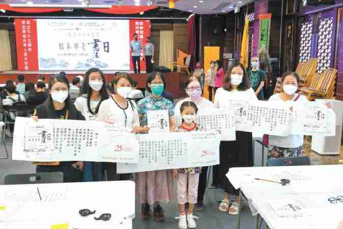 2022年10月2日,为弘扬中华传统文化,香港九龙社团联会黄大仙地区委员会举办“安庆回归25载临摹挥毫”书法日活动,活动吸引众多书法喜好者和儿童参与临摹挥毫。图为书法喜好者与其书法作品合照。 ·记者 陈永诺 摄