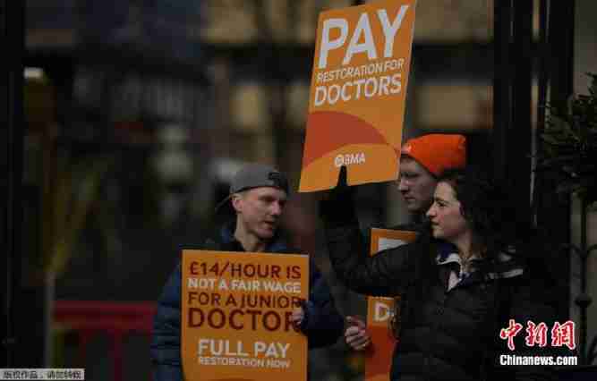 2023年3月14日,英国的初级医生在伦敦圣玛丽病院外举着标牌举行歇工活动。