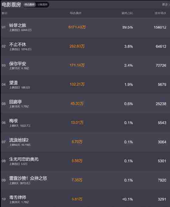 1、铃芽之旅:6244万(6171万)【上映首日】