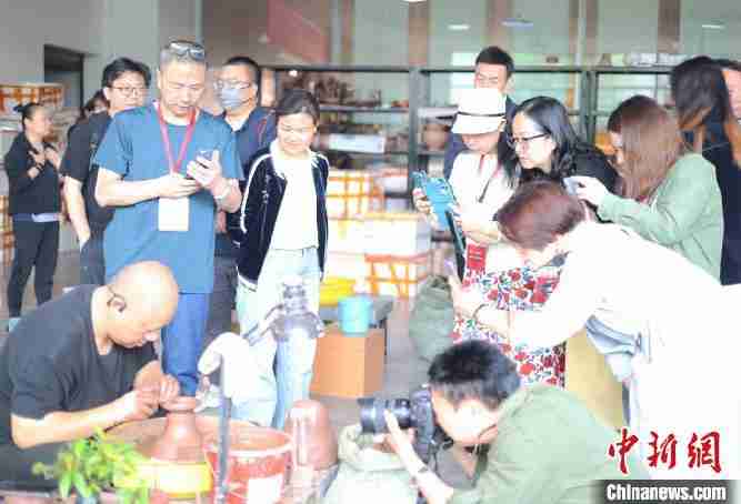 图为海外华文媒体嘉宾参访制作陶器过程。 李可怡 摄