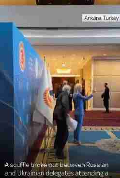 ·5月5月电 综合外媒报道,本地时间4日,在土耳其安卡拉举行的黑海经济合伙组织议会大会(PABSEC)会议间隙,俄乌代表团成员因为一面乌克兰国旗扭打在了一起。