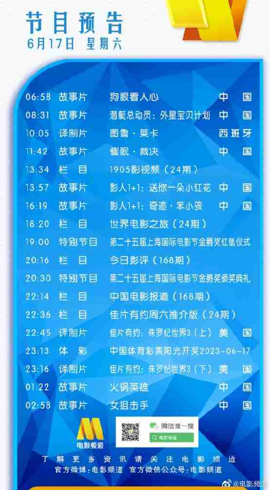 2023年6月17日是本周的周六,CCTV6频道今天将播出第二十五届上海国际电影节金爵奖红毯仪式及颁奖典礼,接下来就让我们一起了解一下今天6月17日的电影频道节目表单吧。