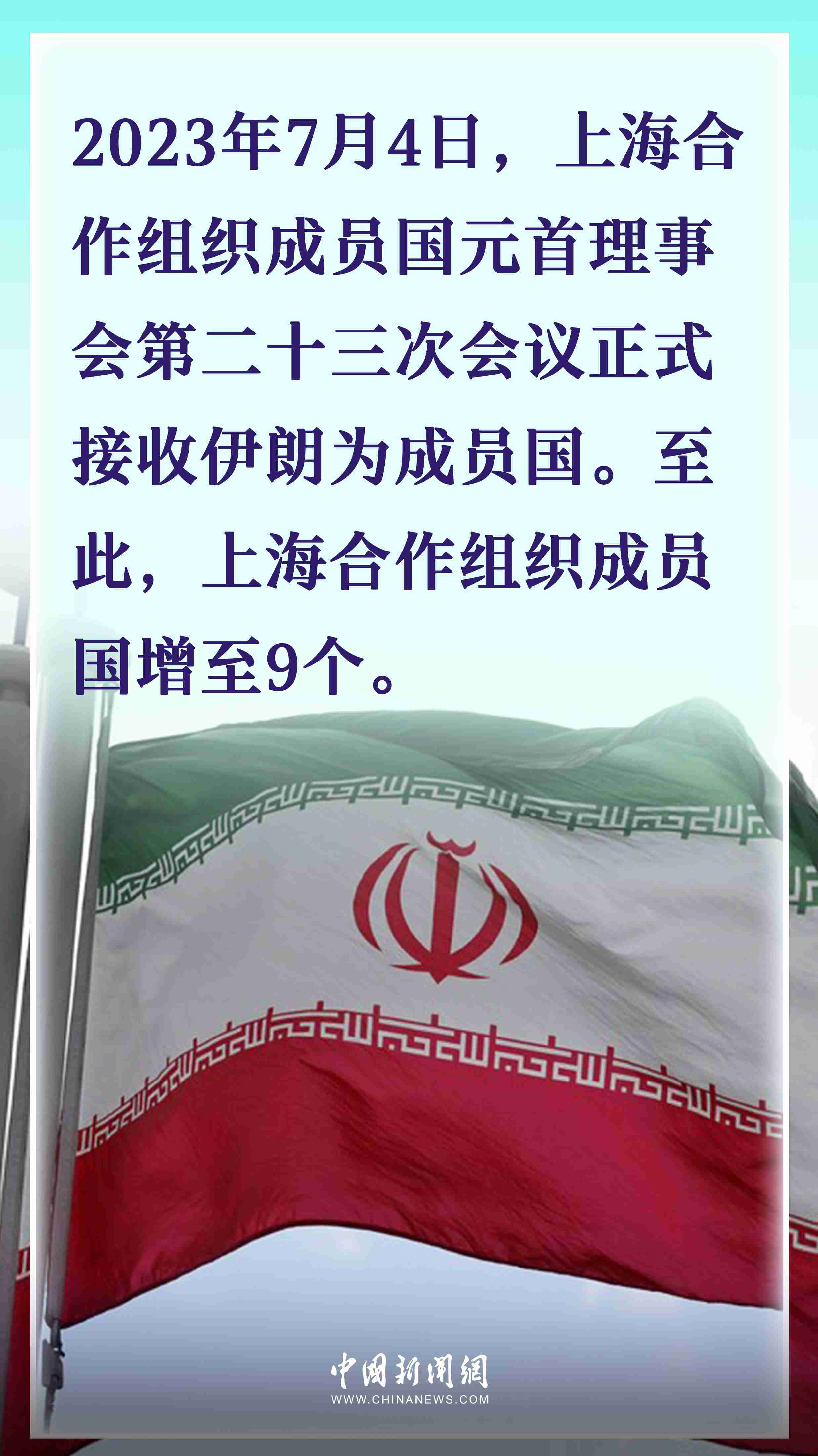 上合组织成立于2001年,创始成员国为中国、俄罗斯、哈萨克斯坦、吉尔吉斯斯坦、塔吉克斯坦和乌兹别克斯坦6国。随着时间推移,上合“伴侣圈”不绝扩容。2017年,上合组织赋予印度和巴基斯坦成员国地位。2023年7月4日,上合组织再次注入“新鲜血液”,伊朗被正式接纳为第9个成员国。