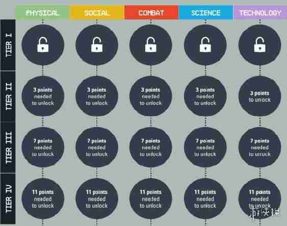 4.各类另外技能又被分为4个梯队,在同一类别下投入3点技能点后可解锁第二梯队的技能,投入7点可解锁第三梯队,投入11点解锁第4梯队。