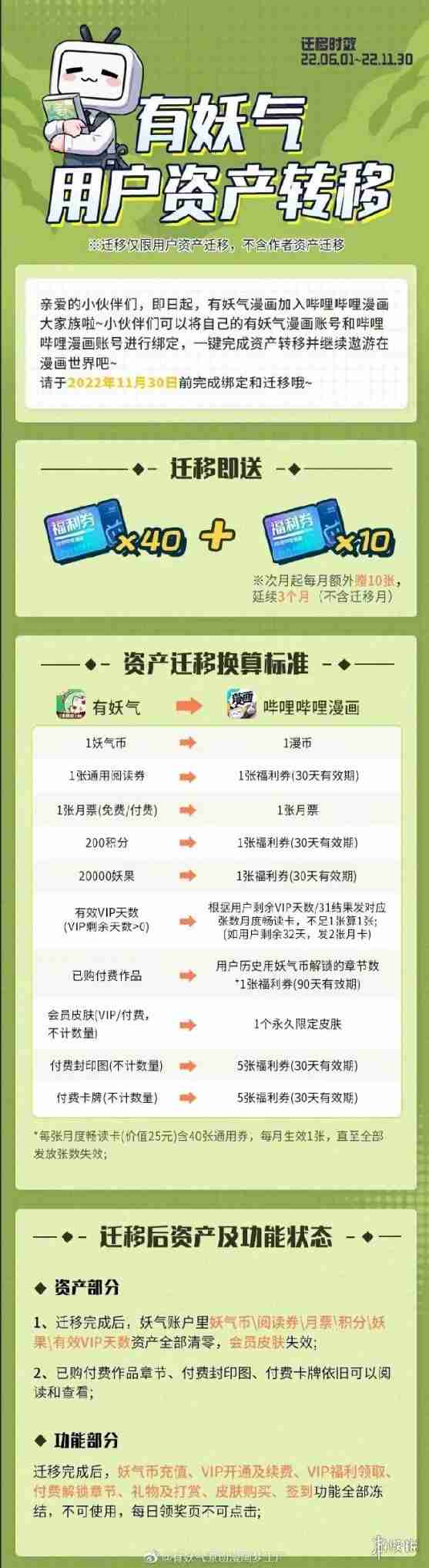有妖气漫画官方公布公告称,将于 12 月 31 日正式关停,未来将在哔哩哔哩漫画继承提供办事。同时,有妖气漫画官方提醒用户关注产品的后续时间节点,并尽快完成资产迁移。